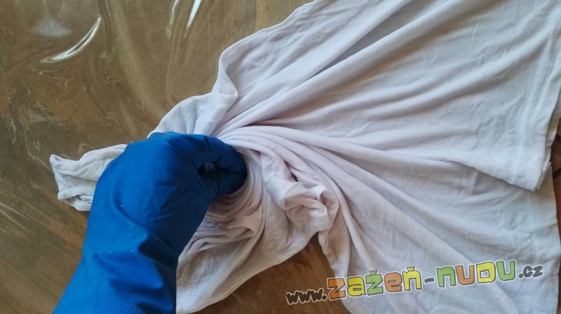 - Textil je před barvením nutné namočit v roztoku krystalické sody. 1 kg sody rozpustíme v 5l horké vody. Přidáme 80g soli a důkladně promícháme. V tomto roztoku tričko namočíme a důkladně vyždímáme.