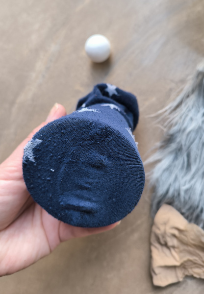 - Na polystyrénový kužel navlečeme ponožku. Vrchní část odstřihneme a okraj přilepíme ke kuželu, aby ponožka nesjela.