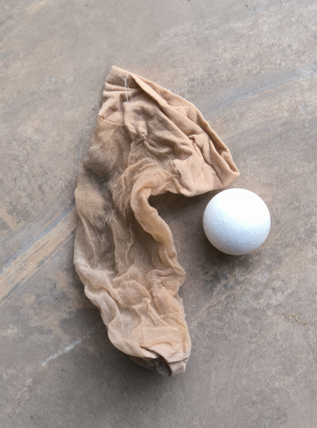 - Nyní si vyrobíme nos. Polystyrenovou kuličku navlečeme do silikonové ponožky a zavážeme jutovým provázkem. Přebytečnou ponožku a provázek odstřihneme a nos nalepíme tavnou pistolí nahoru doprostřed vousů.
