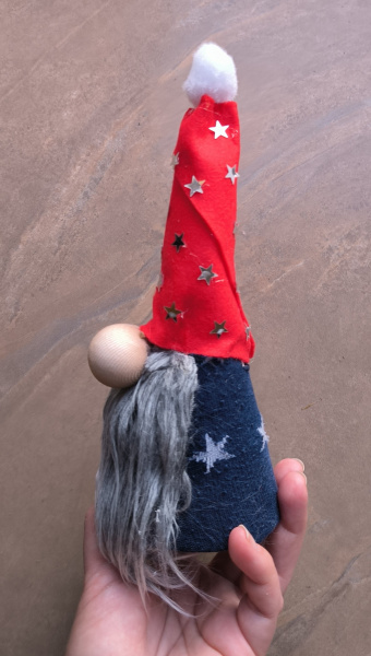 - Z červeného filcu vystřihneme větší trojúhelník (poměřujeme přiložením na hlavu trpaslíka) a nalepíme ho trpaslíkovi na hlavu. Je dobré si nejprve přilepit přední část a potom postupně přilepovat okraj čepice doleva i doprava, aby spoje byly vzadu.