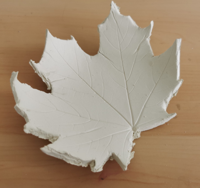 - Na plát hmoty položíme list, rubovou stranou dolů. Válečkem list důkladně otiskneme do hmoty.