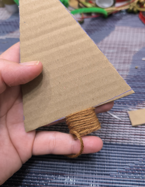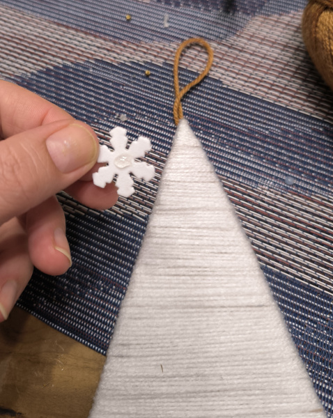 - Z hnědé vlny si ustřihněte kousek a uvažte si očko na zavěšení stromku. Očko přilepte na zadní stranu stromku.