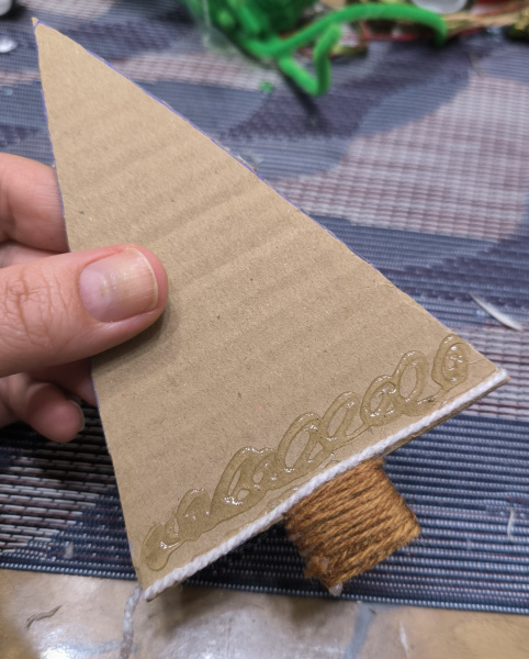 - Kmen stromu polepte lepidlem a omotejte hnědou vlnou. Dobře přilepte hlavně začátek a konec vlny, aby se vám výrobek nerozpletl.