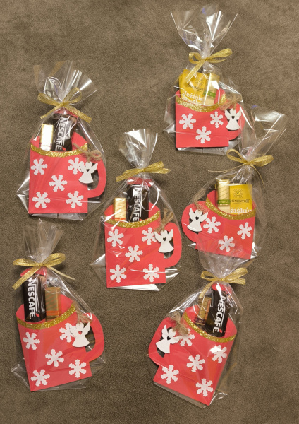 - Hrníček naplníme dobrotami. Můžete použít jednotlivě balené kávy, čokoládky, čaje,...