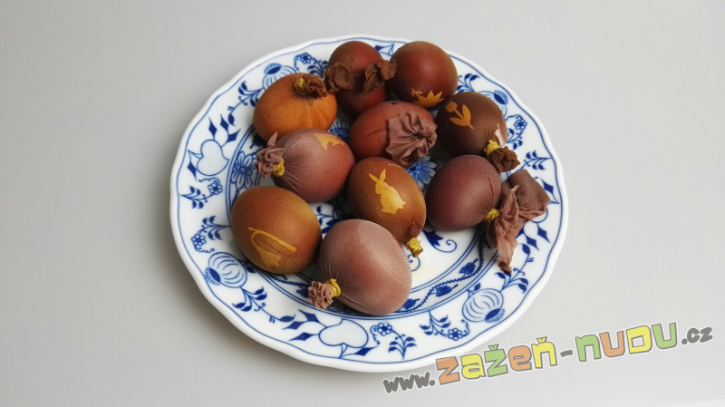 - Do hrnce dejte cibulové slupky (plný hrnec) a vodu. Vložte vajíčka a vařte 10 - 15 minut.