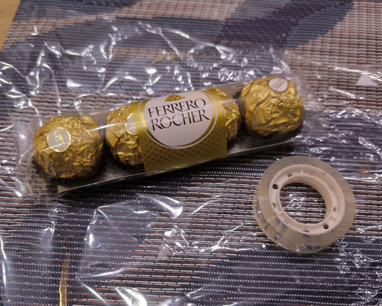 - Bonbóny naskládáme na celofán jeden za druhým. Celofán ustřihneme a vytvoříme pomocí lepicí pásky dlouhý tunel (cca 50 cm)