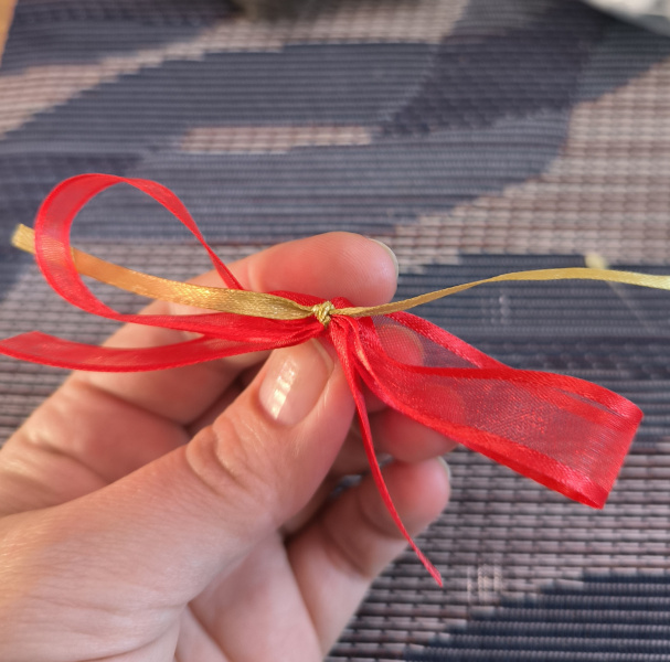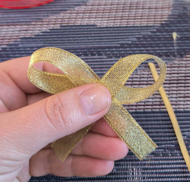 - Ustřihneme si cca 30 cm červené stužky a uděláme si z ní mašličku. Ze zlaté stuhy uděláme mašličku trošku menší.