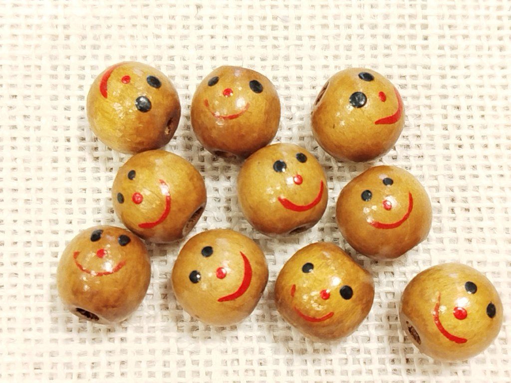 Provrtaný dřevěný korálek o velikosti 1,5 cm s potiskem obličeje.