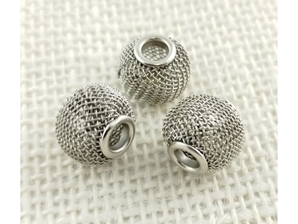 Kovový pletený korálek - kulička 14x12mm - platina