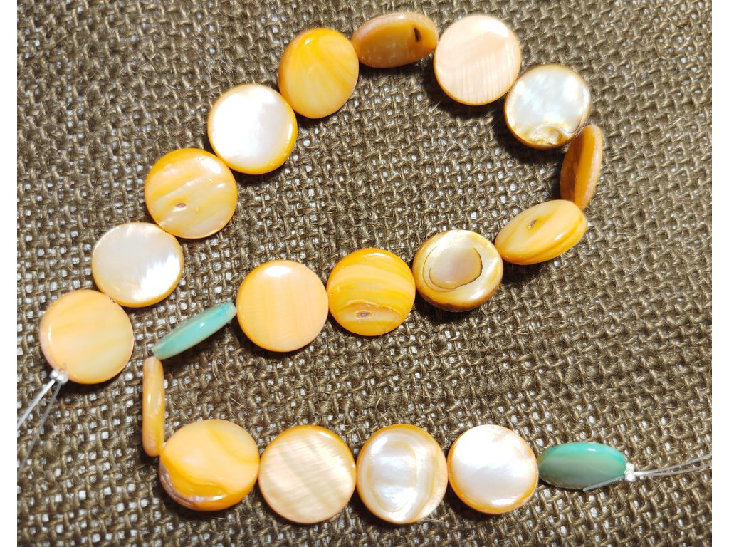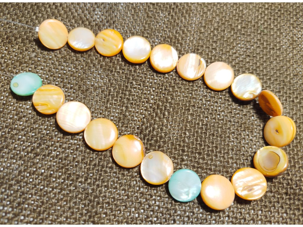 Perleť je přírodní materiál získávaný z lastury a ulit mlžů tropických moří i říčních škebli. Model placička průměr 15mm.