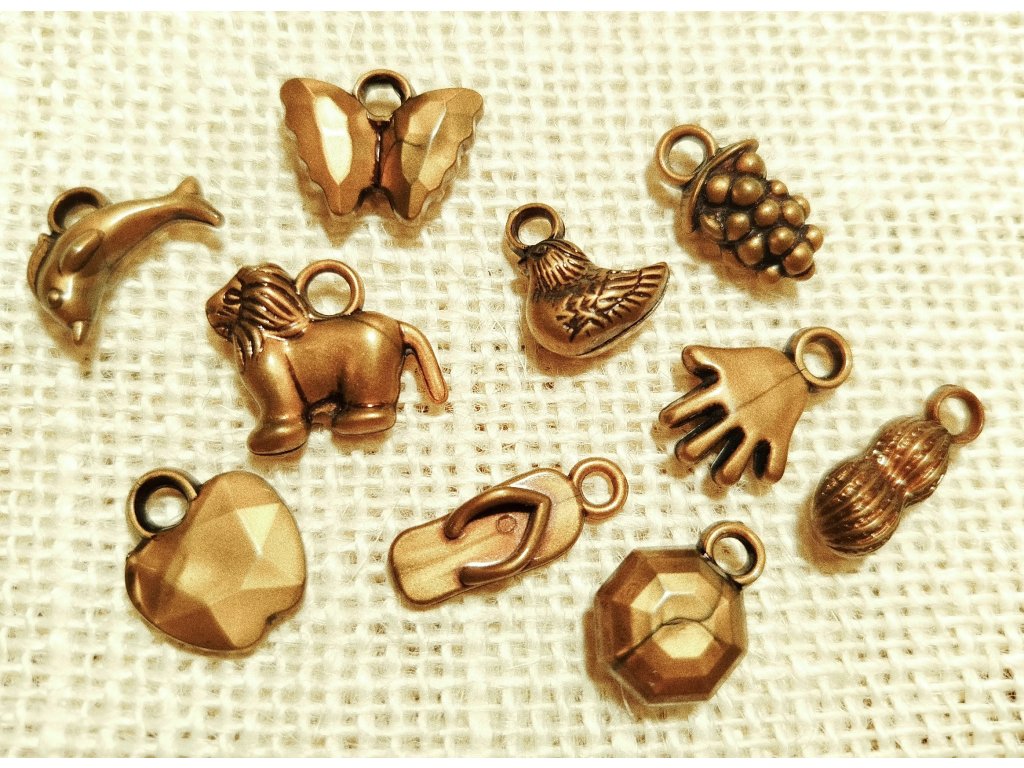 Bižuterní přívěsky ve výhodném balení 10 kusů, barva staromosaz. Materiál acrylic.