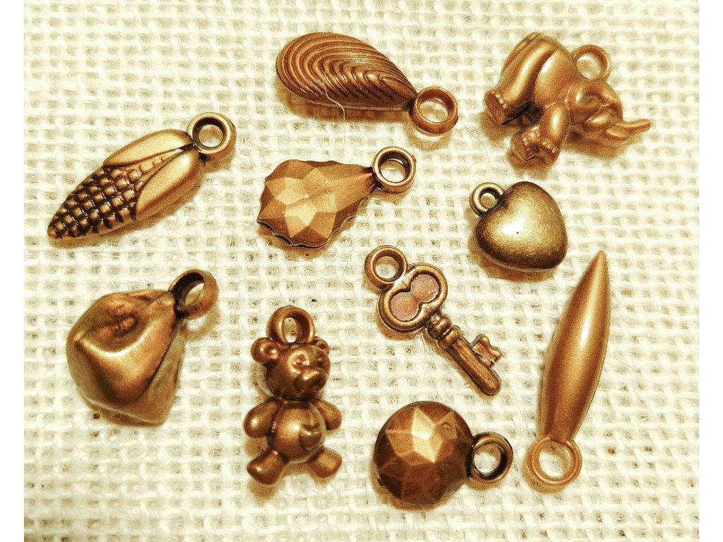 Bižuterní přívěsky ve výhodném balení 10 kusů, barva staromosaz. Materiál acrylic.
