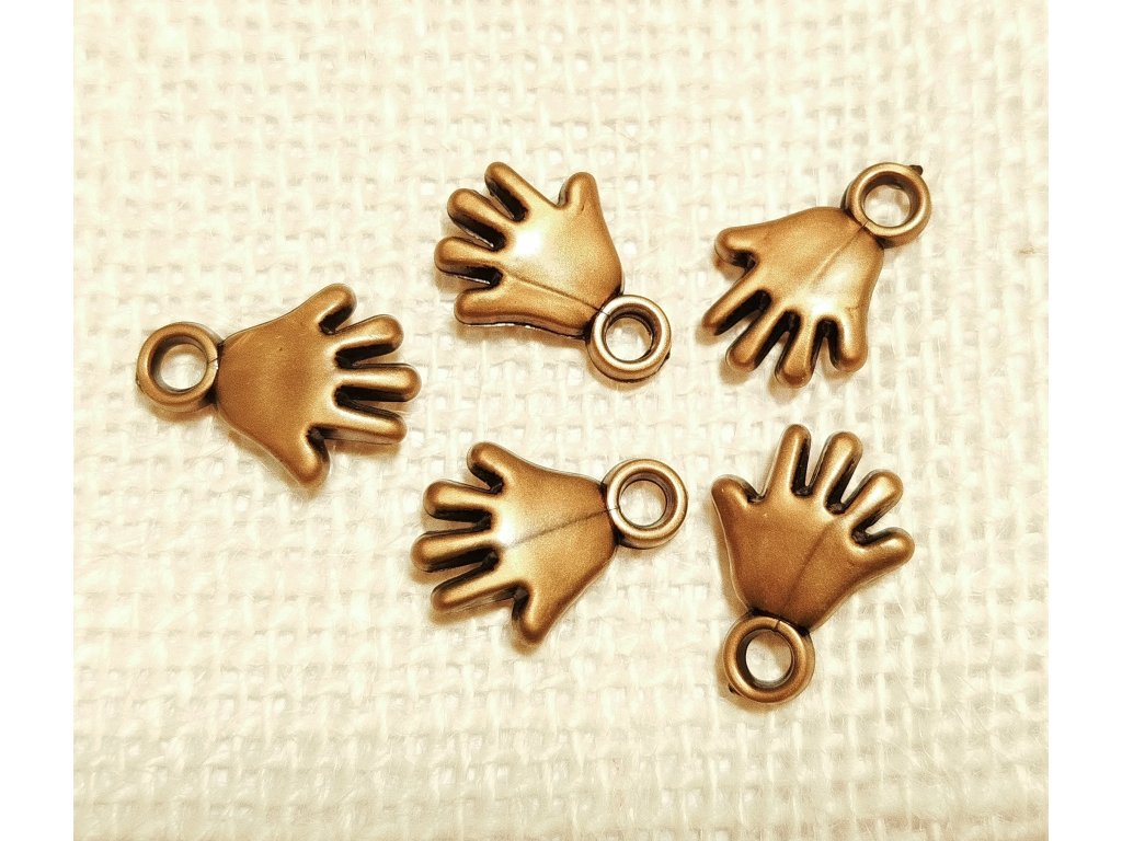 Bižuterní přívěšek ve tvaru ruky, barva staromosaz, velikost cca 19x14 mm . Materiál acrylic.