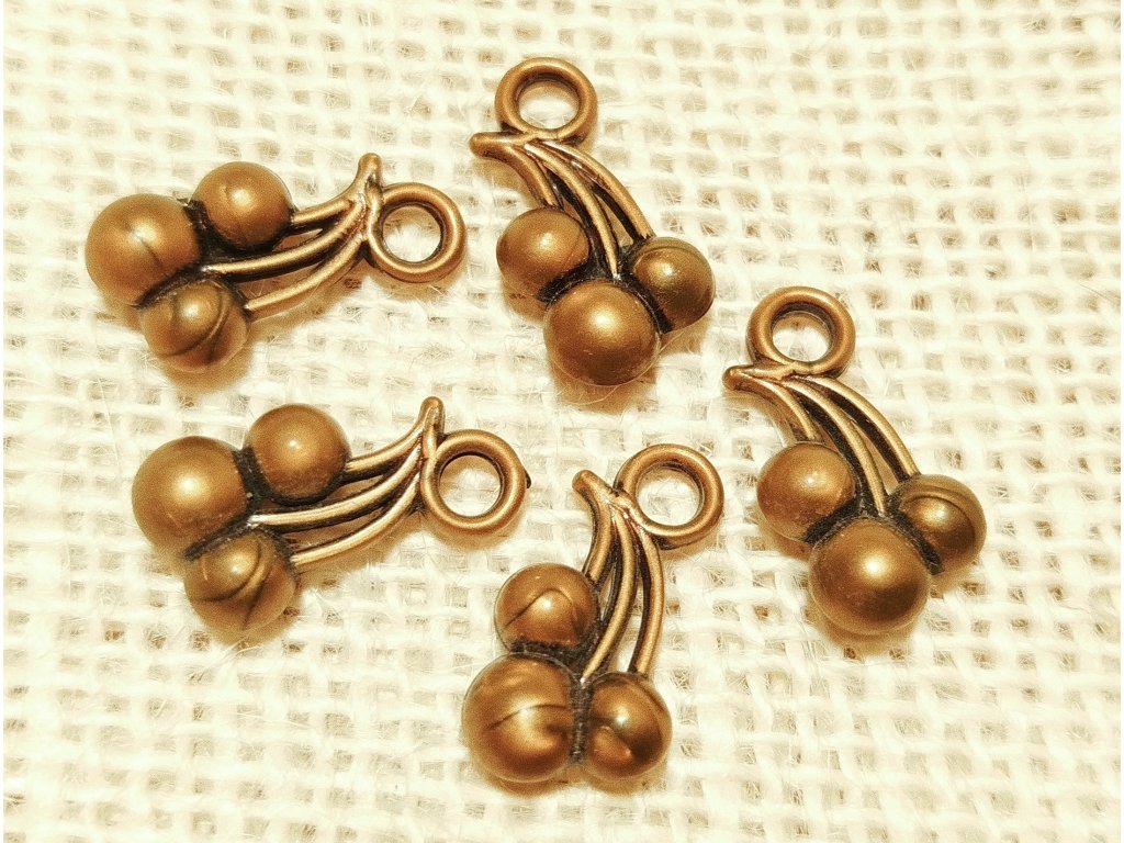 Bižuterní přívěšek ve tvaru třešní, barva staromosaz, velikost cca 20x11 mm . Materiál acrylic.