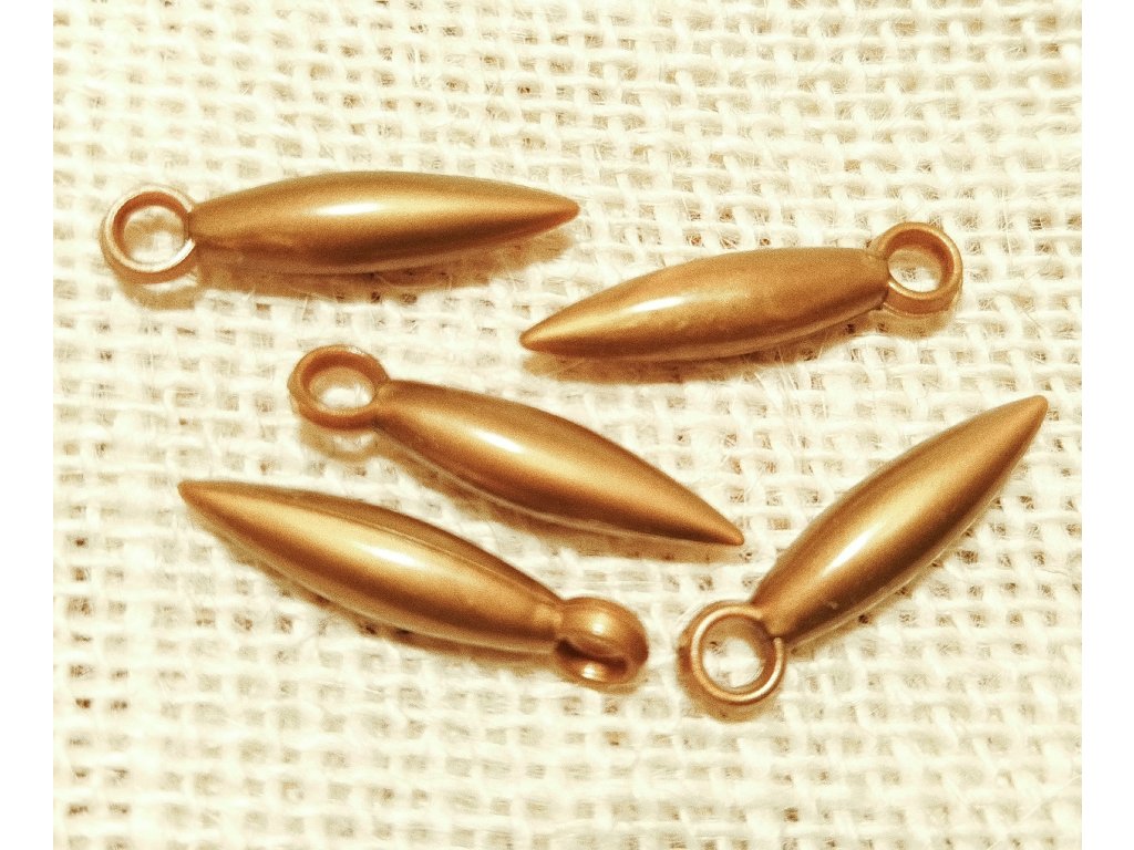 Bižuterní přívěšek ve tvaru vřetena, barva staromosaz, velikost cca 28x6 mm . Materiál acrylic.