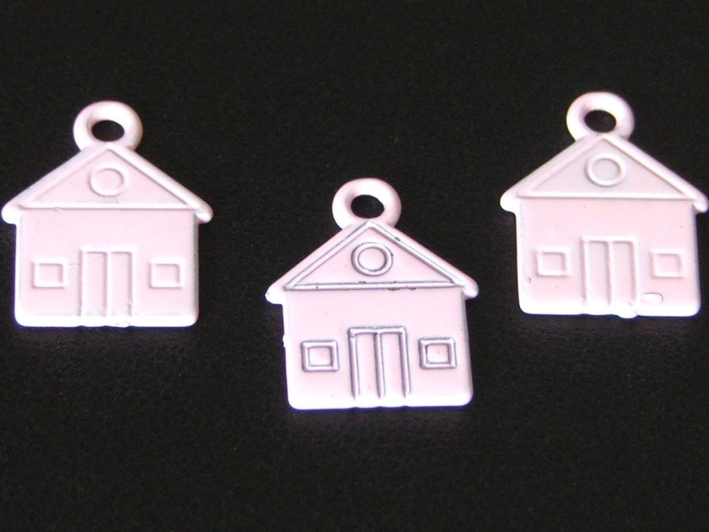 Korálek z barevného kovu ve světle růžového domečku, velikost 16x13 mm.