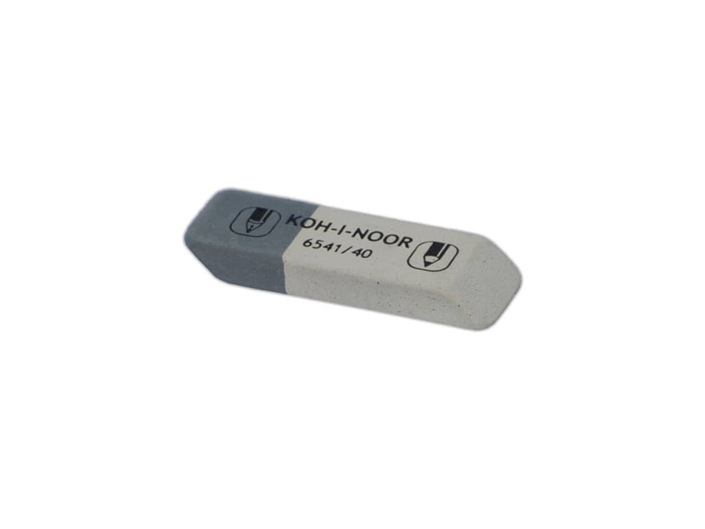 Pryž kombinovaná, výrobce KOH-I-NOOR. Barva - bílo/šedá. Měkká část (bílá) je určena na gumování grafitových čar středních tvrdostí. Tvrdá část (šedá) je určena na gumování čar a skvrn inkoustu, tuše, písma psacích strojů a snímacích tuh. Rozměry 55 x 14 x 8 mm.