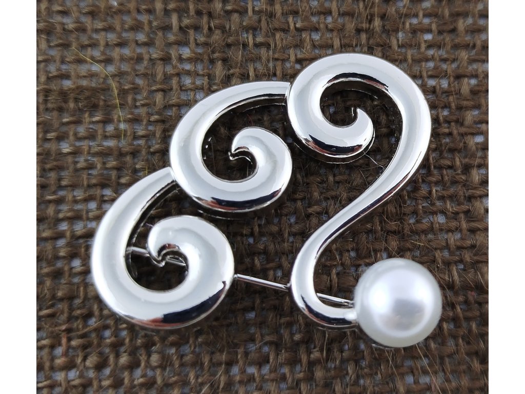 Krásná brož s perlou ve stříbrné barvě ve tvaru vlnek
